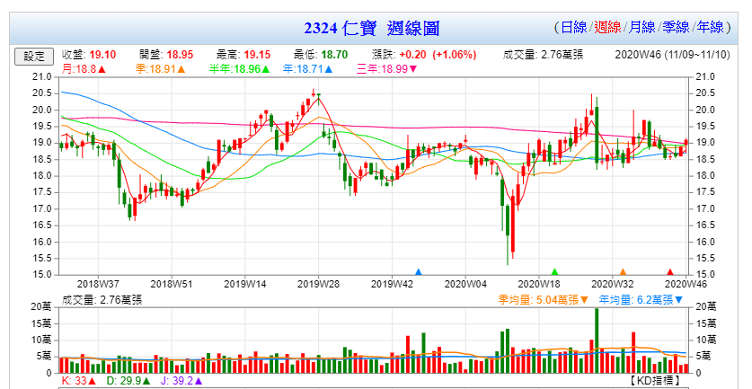 圖5 拉近到週線來看,也可以發現類似的週期現象,底部大概在17元,均線18.6,頂部大概20元,20201110的報價19.1元。